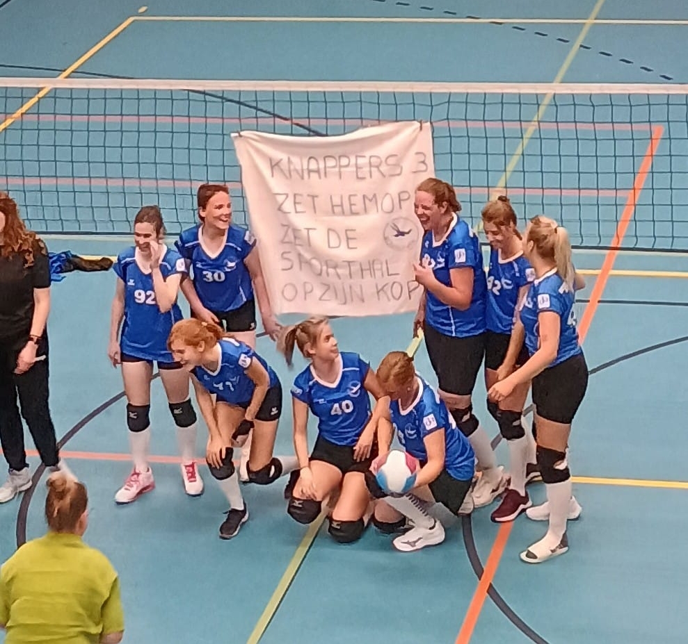 Maandagavond 12 mei moesten Dames 3 KC de laatste wedstrijd spelen in hun competitie. Ze werden o.m. middels een spandoek aangemoedigd door enkele mensen uit onze recreantengroep. Enkelen van Dames 3 KC trainen woensdagavond wel eens mee met de recreanten als de bezetting vanuit de recreanten laag is. Dames 3 KC was blij met de aanmoedigingen en wonnen de wedstrijd. Ze zijn derde geworden in de Knapper-competitie.